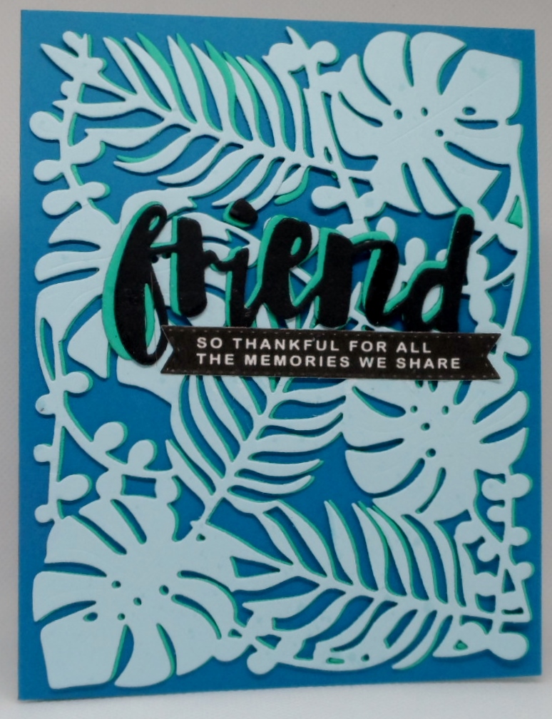 It’s a timed challenge at the As You See It Challenge blog and I almost got stuck for time in my foilage card. So the challenge was to create a card under 10 minutes with a foilage theme after collecting all supplies. I CASE’d a Hero Arts card I saw today on their YouTube channel and decided to give it a go. After cutting out the Hero Arts Jungle Fancy Frame die twice in two different shades of cardstock, used my roller brush thingy to get out the pieces of the die….well at least most of the pieces….then used a spray adhesive to adhere in offset layering to my card base. I decided to add the Simon Says Stamp Painted Friend word die also cut twice and added Bonnie’s sentiment strip to complete my card. Good thing I precut the sentiment strips and although a little crooked, I kind of like the idea of this card. Time to wash my sticky fingers and clean up the die pieces which will take another 10 minutes or so.