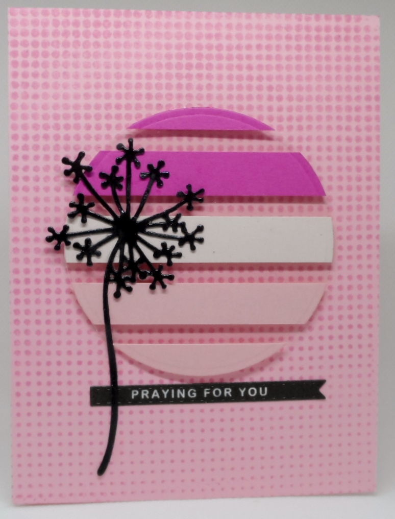The pink card was the first card I created using the floating strips idea, cut out a dandelion die and smeared some glossy accents on it, stamping the background with Simon Says Stamps’ halftone square background stamp and adding a Bonnie sentiment. This one is not for the Double D Challenge but thought I’d share it anyway.