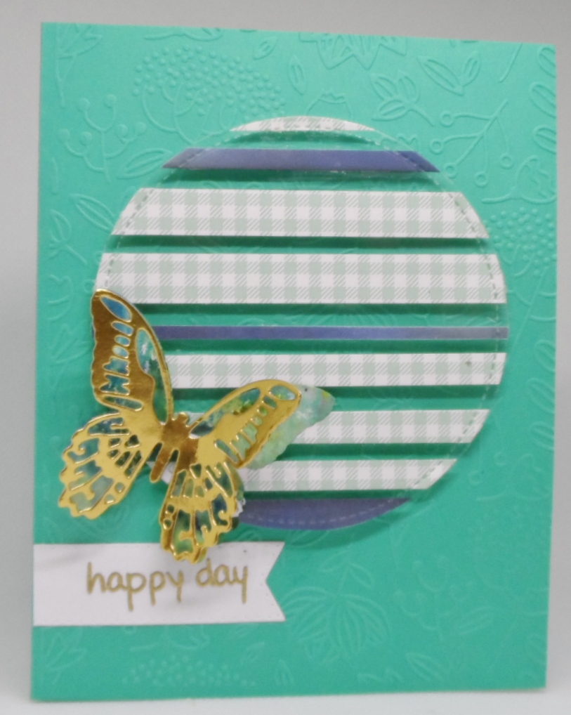 Our challenge for the Double D Challenges is to use Summer Gingham on your project. After thumbing through my supply of Gina K Designs patterned paper packs, I chose this light aqua-ish piece of gingham and cut it into strips. The strips along with a few solid pieces of cardstock were glued to a clear transparencies sheet and then die cut it with a GKD circle die. After die cutting, I popped the “floating” image with foam strips, dry embossed the card base with a Momenta embossing folder, added a Tim Holtz Sizzix layering butterfly die and stamping the sentiment from Stampendous’ Daisy Thanks stamp set in gold embossing powder. The Floating strips tutorial was from Splitcoaststampers and can be found here.