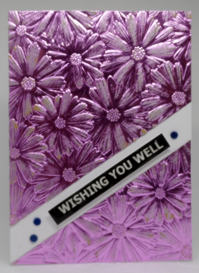 I haven’t played along with The Sisterhood of Crafters challenge in awhile so their challenge to include either heat or dry embossing interested me. It interested me enough to pull out the SSS Floral Field 3D embossing folder and emboss it on a piece of foil cardstock, lightly sand the raised image, cut it apart for my Bonnie sentiment strip which was popped up and added a few blue sequins to finish off this card. I thought that my sentiment strip needed some shine so I added glossy accents but now I’m wondering if I should have used versamark and clear embossing powder to add the shine. Any suggestions??