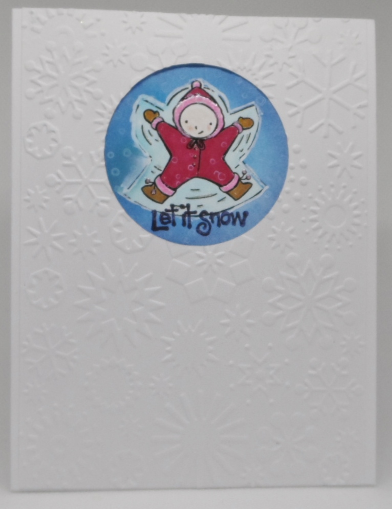 Both cards use SU’s Wonderful Winterland stamp set and sentiment is Penny Black’s Christmas with Mimi. Spellbinder’s nestabilities circle die was used to create my twinchie and on the top card I couldn’t resist adding some “snow” with SSS large falling snow stencil. The bottom card I used cuttlebug’s snowflake embossing folder.