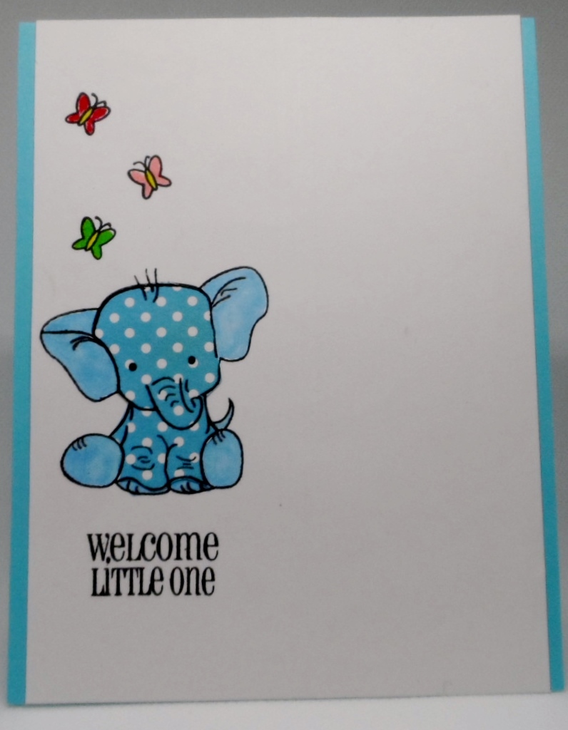 Another baby card for my new grand-friend’s parents. So another attempt at a CAS along the edge card using Beth Silaika for GKD’s Bella Elephant stamp set, some patterned paper for paper piecing and although you cannot see it I scored three lines next to my image to complete the optional twist of dry embossing for this week’s challenge.