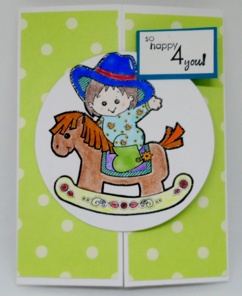 I feel like a rebel instead of the rule person that I normally am. I turned my version of the sketch into a gatefold card. With those two strips behind the circle, the sketch just seem to scream gatefold to me. And I jumped in that direction. I have all of the elements and move the sentiment to the top right. It was a fun card to create using stamps from Stamp Oasis’s Little Cowboy and Gina K Designs Oh Baby! and patterned paper from my stash.