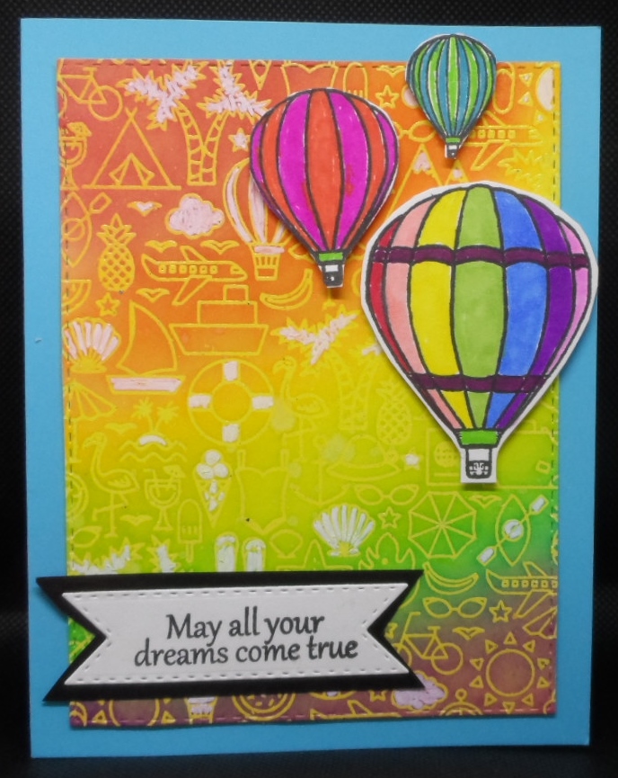 If you look closely at my very brightly colored background you will find several in the air items. And although not an actual rainbow, my background is rainbow colored. But just to meet the challenge requirements, I added several hot air balloons. That wonderful background is from Taylored Expressions’ Summer Vibes red rubber background stamp. The hot air balloons are Gina K Designs’ Up & Away stamp set illustrated by Theresa Momber.
