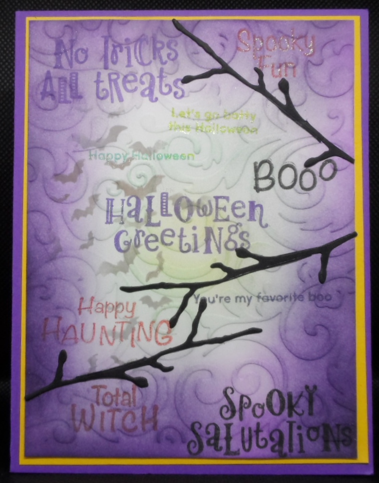 Love these Halloween challenges! It’s a great way to help finish my cards. For today’s card, I stamped, stenciled, ink blended, dry embossed and heat embossed a variety of my stash. It was a variety of stamp sets for the greetings like Simon Says Stamp’s Happy Haunting, a set from Recollections Halloween, bat stencil. This was fun to make and I should have noted all of the stamps and items used before losing them on my desk!!