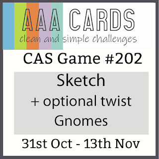 Getting this card in slightly under the wire with the challenge over at AAA Cards which is a sketch challenge with an optional twist to add a Gnome. How could I not play along? Today’s card uses an older red rubber stamp set “Season’s Greetings” from Gina K Designs which was stamped in white pigment ink then heat embossed with white embossing powder. My gnome twist is SimonSaysStamps’ lil gnome die. I did have a bunch of bodies cut out from the past so only need to cut a beard, nose and base and assemble together. Since I had action wobblers on my desk from some Thanksgiving cards for my grandkids, I decided to give Lil Gnome a little wobbling action.
