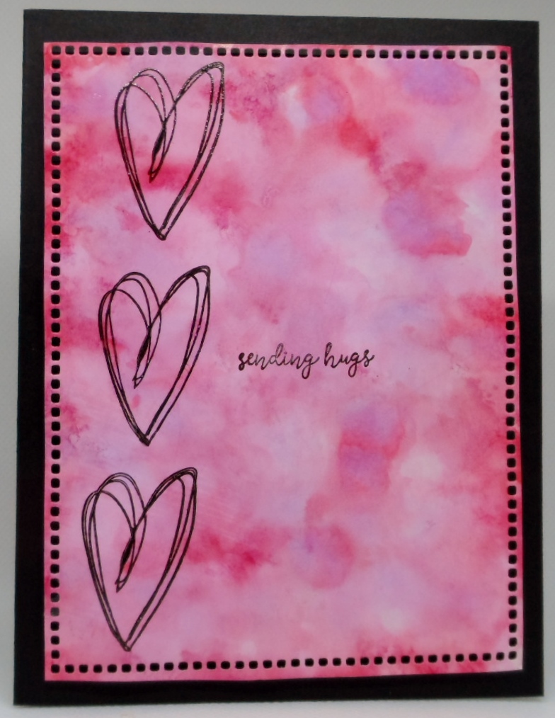 Not sure if I completely met the minimalist challenge or not but my image is repetitive, simple and angular edges. My background was my attempt at Gina K Designs’ Stamp & Chat background using GKD reinkers and rubbing alcohol on glossy photo paper, then stamping with clear stamps which SHOULD pick up the ink….NOT! So since that was a fail, what did I have to lose but ink in VersaFine ink and clear ink emboss. I was happy to save the background even though the technique did not work. My stamps are an older Inkadinkadoo Hearts stamp set and sentiment from a cute Recollections Valentine set that I picked up at Michael’s a few years ago. The focal panel was die cut using Spellbinders Hemstitch Rectangles die. This was an interesting, different challenge that was fun to play along.