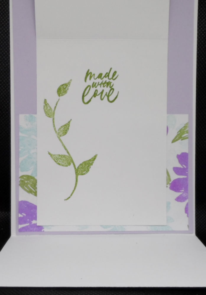 The front smaller card lifts up and the patterned section folds down to create my fun fold. I found this idea on Pinterest. Here’s the inside vies of my fun fold card.