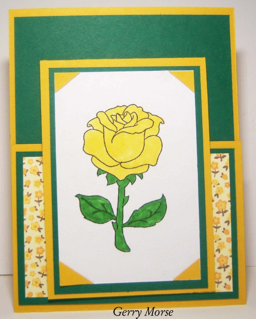 Today’s card is a CASE of Gayle’s from Feb. 22. Because the card would not stand up, I thought an easel back would work. The problem with that was that the bottom flap would fall open, so, I decided to tape the edges of the bottom flap and make it into a money holder. Pp is a piece I’ve had for years, cs is SU. Image is from an online coloring page colored with Copic’s. The plain white image panel needed something, so I just added small hand cut photo corners. The inside sentiment piece was printed on the computer with clip art roses added. I so hope I’ve done this right. Thanks for checking it out.