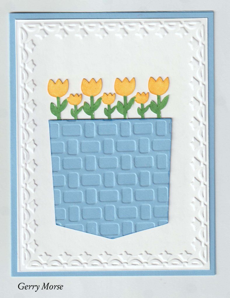 Gerry, your card is wonderful with the different embossed textures. Love the blue pocket and those pretty tulips. You made me laugh with your comment about spraining your ankle spraining your brain. I think we all have those times of our brains not keeping up.