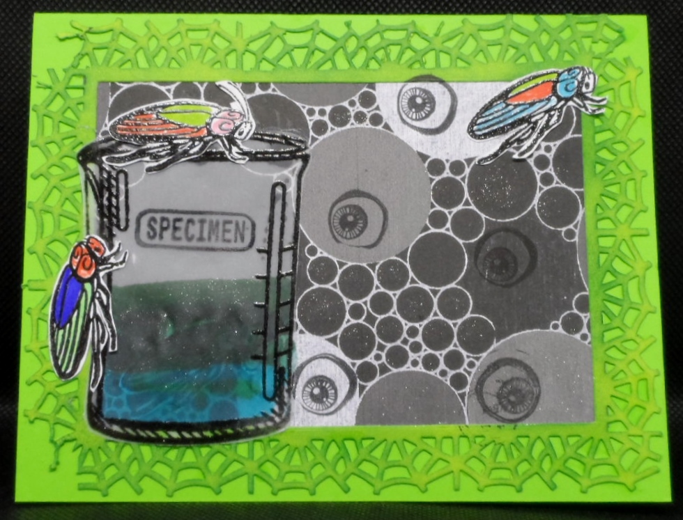 Back to my card, I created a frame using a Martha Stewart spider web punch and then die cut the middle section which includes a very cool piece of patterned paper from my stash to which I added some eyeballs and wink of stella. My stamp set is Inkadinkadoo’s Test Tubes. The specimen beaker was stamped in black and heat embossed in clear embossing powder on vellum paper. After adding some color to the back of the beaker I stamped and fussy cut my flies who seem to have escaped from the beaker.