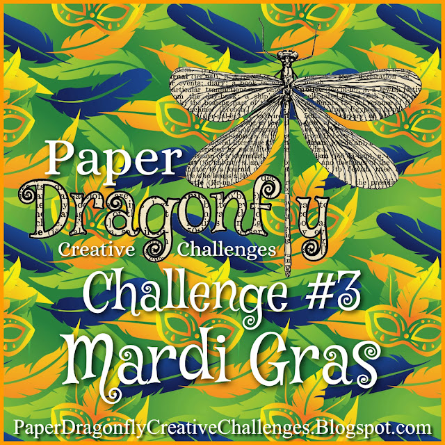 The challenge with Paper Dragonfly Creative Challenges #3 theme is Mardi Gras with the added dragonfly. I chose Mardi Gras colors of purple, green and gold. So thought my Spellbinders Fleur DeLis die would be appropriate and die cut the smallest die in green and purple and a glitter gold.