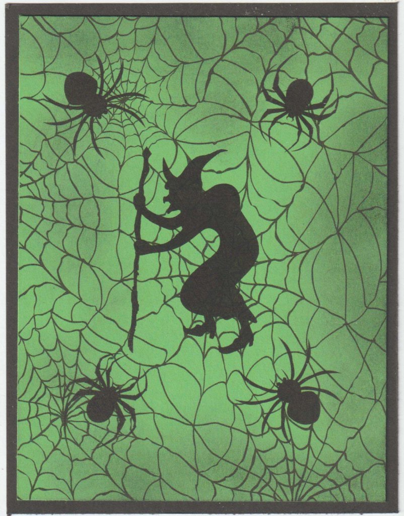 Hello my friends. As you can see, today’s card is for the March Two Old Bats challenge. Again, everything is computer generated. Spider web background paper was found online and I thought it would look kind of cool printed on green cs. Spiders and witch are online clip art. At first my idea was to just sponge black on the very edges. Then I decided to use a cotton ball, with Distress Ink Black Soot, and spread it on a little more than just the edges. I’m actually kind of pleased with it.