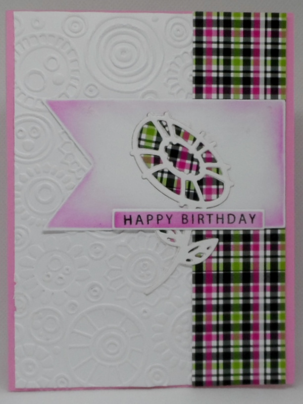 My embossing folder is from Cuttlebug with lots of circle some flowers which may have been a spring bundle. After locating some plaid patterned paper from my stash I added it to a side panel of the embossing folder. Die cut a Spellbinders in’spire Flower Power II die from a SU Banners die and added to my card front. I then die cut the flower from white card stock once again and also from the plaid patterned paper and inlaid the plaid into my petals.
