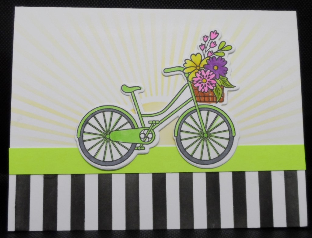 I want to ride it now!! Actually not really sure if I remember how to ride a bicycle. I grew up with two wheels, handlebar and pedal brakes! Listening to some Queen music made me this of this GKD image from Your One Kind of Beautiful StampTV kit for the something with a handle challenge at Double D Challenges. I stenciled the striped bottom using a portion of Pretty Pink Posh’s wide stripes stencil, added a strip of green cardstock, then decided the card needed something else so very carefully masked and stenciled the sun rays from GKD’s Sunshine stencil. The inside of the card repeats the black stipes and green strip with a sentiment and sun image from the same set.