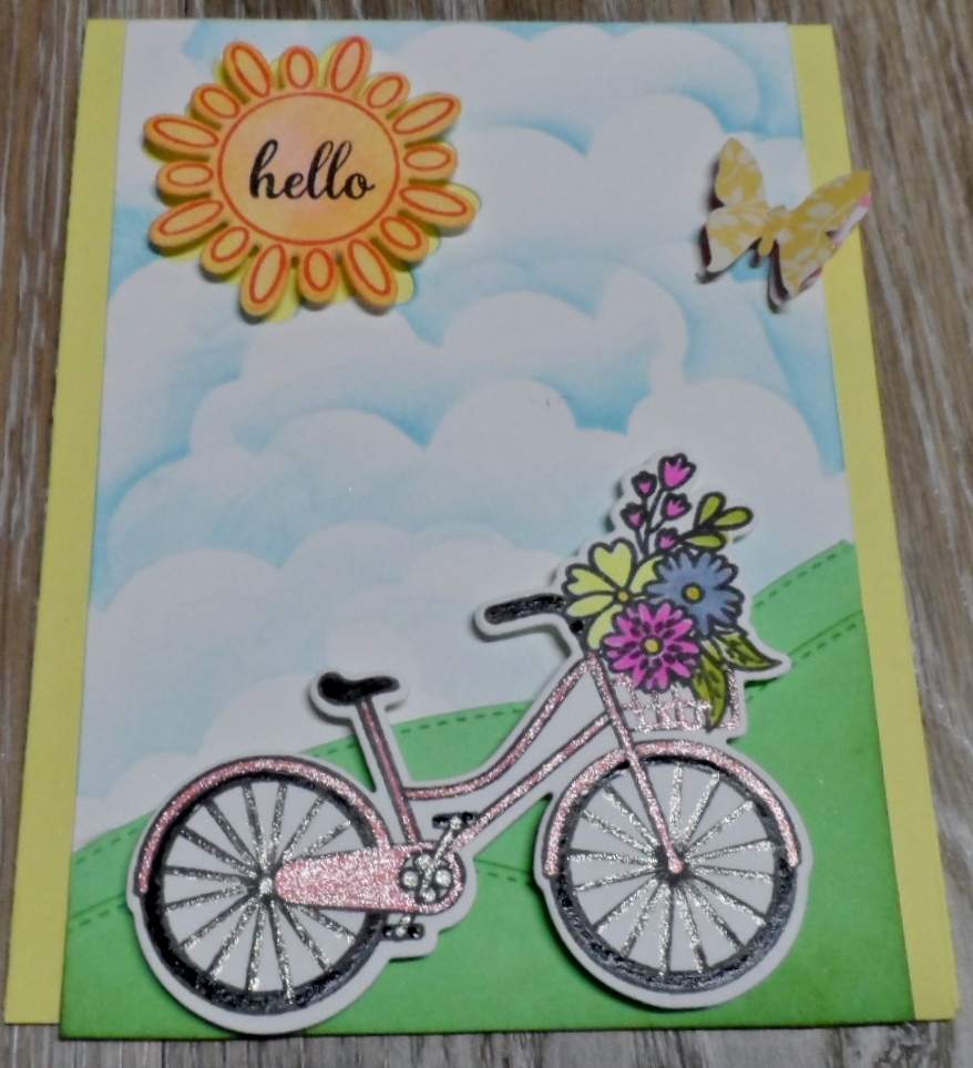 1. Great card and great reminiscing about the days riding my bike. Although I like the pink glittery bike, I do like the background on the newer version.