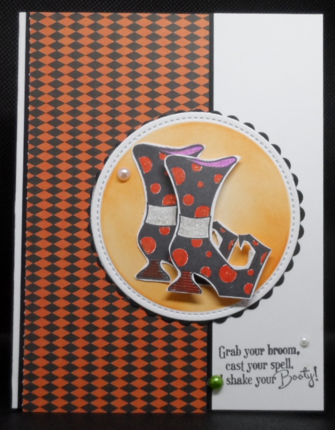 My card for this month’s Two Old Bats Halloween challenge uses very traditional Halloween colors and not scary! LOL!! Keeping my design pretty classic, I used some patterned paper from my stash, stamped and fussy cut the Stampin Up Bootiful Occasions’ witch boots and layered them on some die cut circles. The scary part was my sentiment. I lined it up, looked good but didn’t realize that the a for “and” shake your Booty was on the black layer. Ugh! Thank goodness for those little pearl embellisments that were still on my desk.