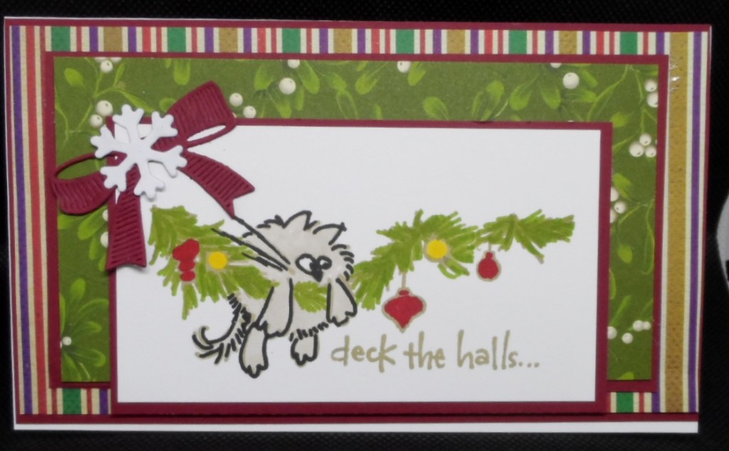 My mini-slimline card features Stampendous’ Fluffles Garland. If my PennyLane had had enough energy, I can just imagine him doing the same thing as Fluffles. Cats! After seeing this month’s Anything Christmas, I knew I had to use this oldie but goodie stamp set. After stamping and coloring in Fluffles and the garland, I layered this image on some red cardstock, then pulled out some patterned papers layering on red and trimming to fit my mini slimline card was all it took to pull this card together. A Poppy Stamps grosgrain bow die and SimonSaysStamp Sensational Snowflakes completed the look.