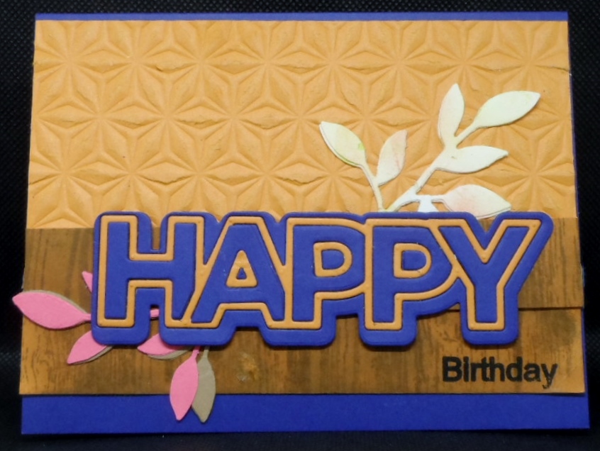 The challenge with the Just Add Ink blog is an inspiration photo depicting the southern hemisphere who are enjoying the cooler temperatures and the season of Autumn. So for my card I opted on the wonderful warm fall colors highlighting some Gina K Designs Sweet Mango cardstock. I embossed the top portion of Sweet Mango with SimonSaysStamp’s Kaleidoscope embossing folder. My bottom portion was stamped and inked using SSS’s wood planks background stamp and inking it in some brown ink. The card base is a navy blue and I alternated the SSS Chunky Happy die between the sweet mango and navy cardstock. Sentiment is GKD’s Stamp It Big stamp set and leaves are Sizzix’s Sizzlits Little Leaves die.
