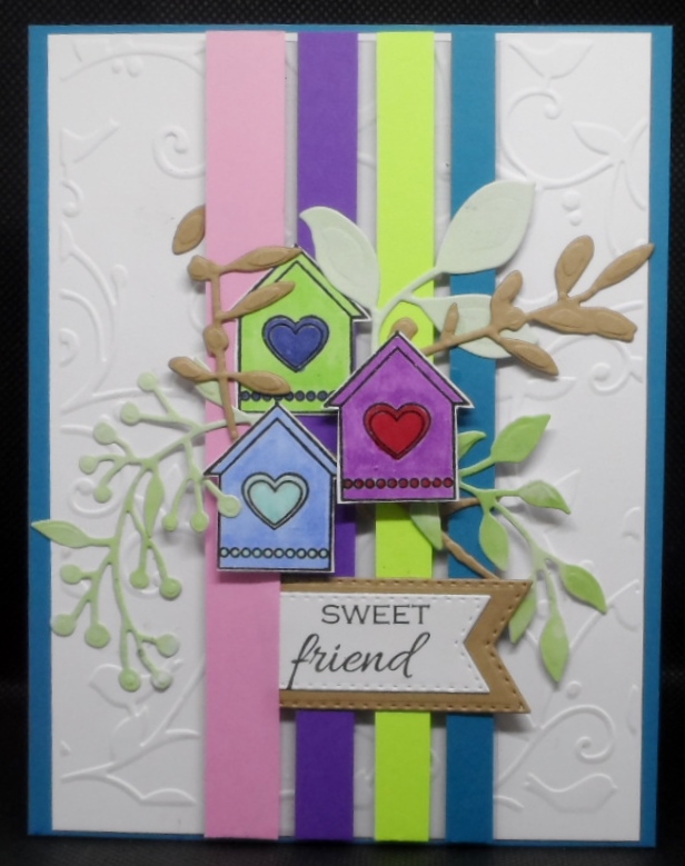 I did find this idea on Pinterest and tried to make it my own. Using a Gina K Designs stamp set named Sweet Friend which may have been a mini or part of a kit, I stamped, colored and fussy cut my bird houses. Sentiment is from the same GKD set but I did some stamp surgery on the complete sentiment. To continue with the bird theme, my Cuttlebug embossing folder is called Birds & Swirls. Some strips of saved cardstock from my stash and Garden Greens die cuts from Tim Holtz Sizzix completes my card today.