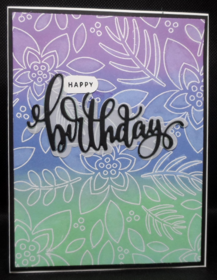Gina K Designs Leafy Stencil, Taylored Expressions Branch Out die, Distress Oxide Inks. SimonSaysStamp Winter Floral background stamp, white embossing powder, Distress Oxide Inks, GKD birthday dieHero Arts Bubbles Bold Prints background stamp, Hero Arts Stamp & Cut mermaid, distress oxide inks, clear embossing powderHero Arts My Monthly Hero kit, background created from the inked mermaid background