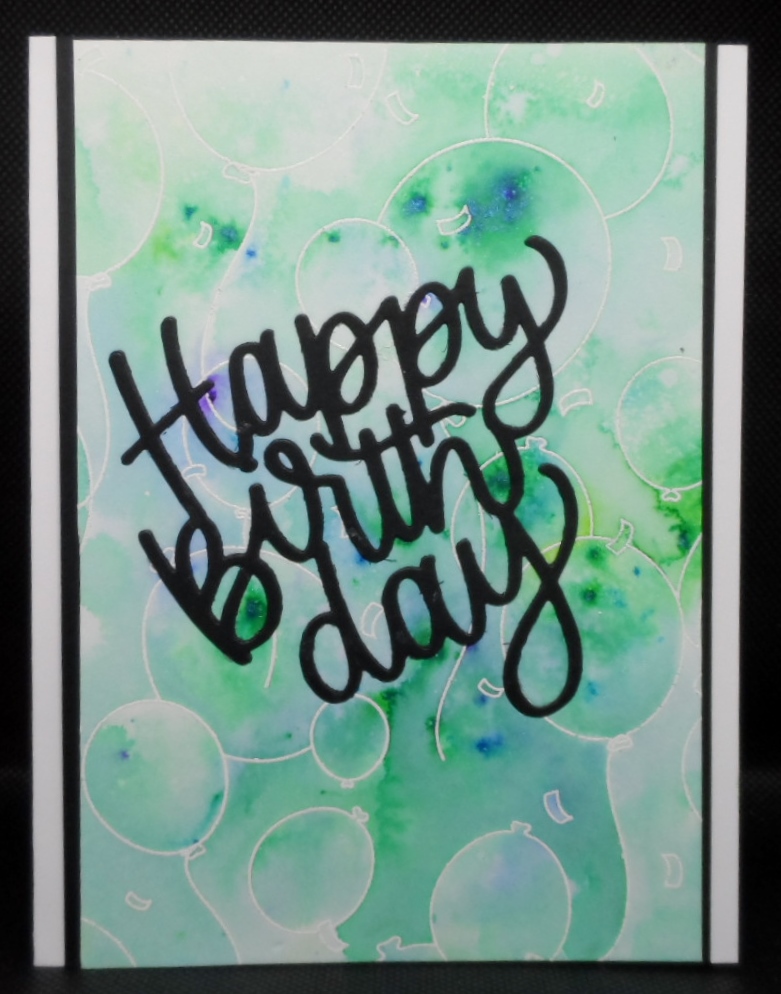 SimonSaysStamp Party Balloons background stamp, SSS, Large Happy Birthday die, Midnight Blue and Peacock Green Cosmic Shimmer Pixie Powder, gel press Instructor – Mindy Eggen