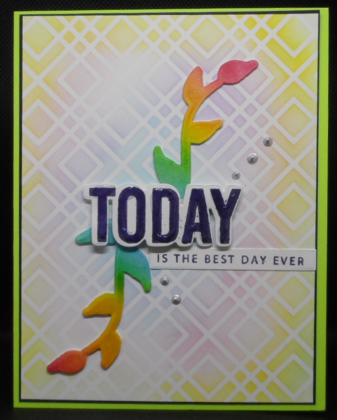 So pretty and bright. Love the rainbow die cuts and the stenciled background.