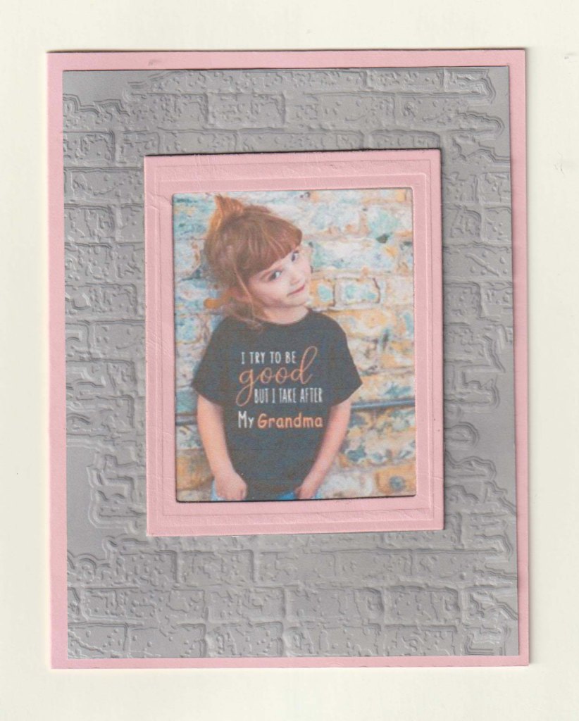 The background in the photo inspired me to emboss the gray background piece with Tim Holtz Brick ef lightly sponged with Basic Gray stamp pad. Frame is Spellbinders Classic Rectangles Small. I loved making this and can’t wait till she gets it.