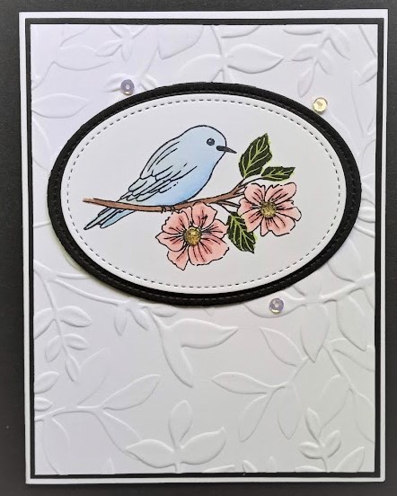 I love watching birds and coloring birds. I used the SU Friendly Hello set for the focal image. The embossing folder is also SU, possibly called Layered Leaves. I colored the images with Spectrum Noir markers. The oval dies are a combination of SU and Gina K Designs. I chose not to add a greeting to the front. I will place something inside when I am ready to send the card.