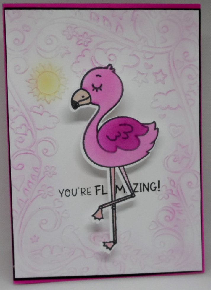For my bird, I decided on a flamingo from Taylored Expressions’s Tickled Pink stamp, stencil and die set. My embossing folder is a larger Cuttlebug folder with some swirls, flowers, hearts, birds and a sun. I lightly sponged ink over the raised embossed areas, mounted my flamingo on an action wobbler, layered with black cardstock and adhered to a 5×7 card. Hmmmmm…..so the sun ended up on the bottom of the card so I very carefully lifted the layer off the card base and turned it around. Hmmmmm….now my flamingo was upside down. Sigh!!! popped that pink bird off very carefully and decided to add the “You’re Flamazing!” sentiment under the flamingo’s legs. Adhered everything down once more and completed my card for the day.
