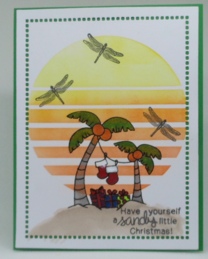 Paper Dragonfly Creative Challenges #7 is a Christmas in July theme with the normal optional twist to include a dragonfly. Using Newton’s Nook Designs Retro Sun and Palms stencil, I inked some oranges to yellows using only the sun stencil. The palms were stamped using Newton’s Nook Designs Sun Soaked Christmas stamp set. After coloring my palms, presents and stockings, I decided to add some sand. I think the beach bully must have come around and kicked up my sand so I added the sentiment to “smooth” things out a little more. Dragonflies are from Gina K Designs Follow Your Dreams stamp set illustrated by Theresa Momber. After stamping, I added some glitter silver Wink of Stella. The focal panel was die cut from a Spellbinders Hemstitch Rectangle die.