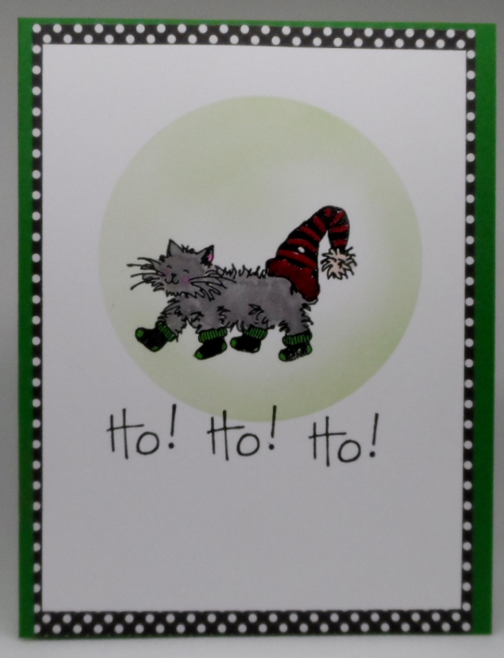 A clean and simple challenge anything goes + Christmas Pets in July challenge is the task with the AAA Cards Challenge blog. I have a lot of snowmen, reindeer, fox and bear stamps but it took awile to find a pet stamp. I finally found this mounted red rubber stamp probably from one of the big box stores in my neighborhood. The stamp is makred as Rubber Soul and “Cat with Stockings and Cap” and then a sentiment for my cat with stockings and cap??? Well the only thing I could think of was this Ho Ho Ho from Katie & Co which I’m quite sure came out of AC Moore’s dollar bin.