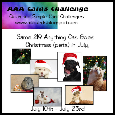 Fun CAS card – as if a cat would wear any of it for long enough to take a pic! Thanks for joining us for our challenge at AAA Cards 🙂