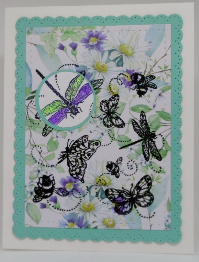 Butterflies, Bees and Dragonflies is the challenge theme with The Sisterhood of Crafters and you may use one, two or all three. What are the chances that I would have an old Inkadinkadoo red rubber mounted stamp in my stash that really has Butterflies, Bees and Dragonflies! I opted to stamp them on Gina K Designs Watercolor Floral patterned paper pad then use the spotlight technique to highlight one dragonfly. The dragonfly was stamped and colored with KaiserCraft gel pens and a Clear Star Gelly Roll pen. Waffle Flowers A2 lacy layers dies were used to die cut my panels and SU circle punches.