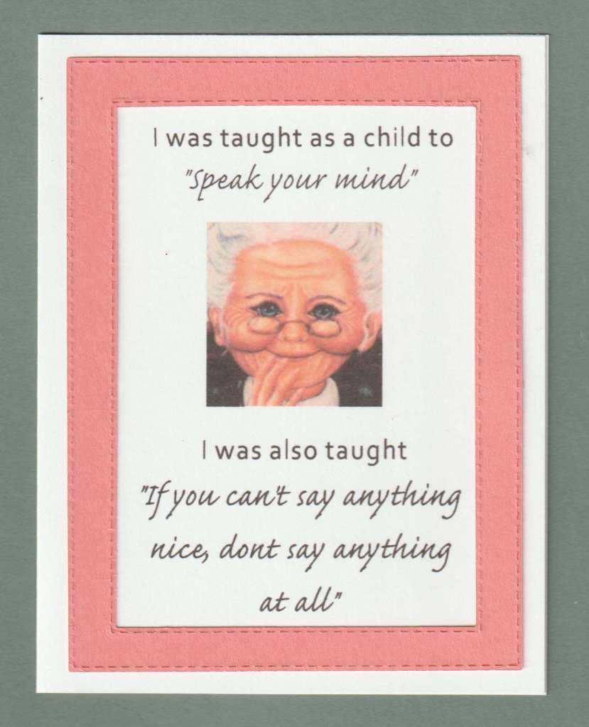 Today’s card is dear old sister’s chuckle of the month. Frame is Rectangle Stitched Framelits from SU. Image and sentiment (“I was taught as a child to “speak your mind” I was also taught “If you can’t say anything nice don’t say anything at all”. Inside “can you see my problem here”.) were found online.