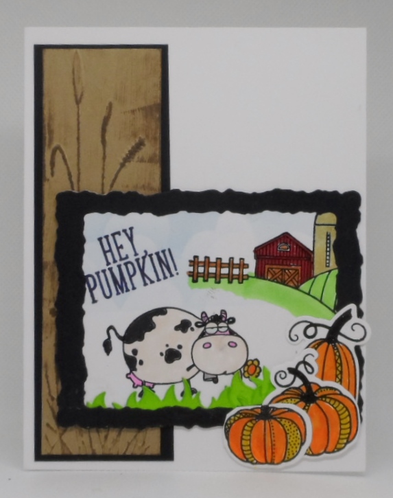 My farm scene with “Moo” cow was made using Gina K Designs Funny Farm stamp set. I die cut come grass for “Moo” to nibble on using The Cat’s Pajamas grass die and the pumpkins from the pumpkin patch are also a Gina K Designs stamp set Haunts & Harvest. For the embossed element, I used a Darice Nature 3 embossing folder as I’m sure there is a pond on most farms with cattails growing.