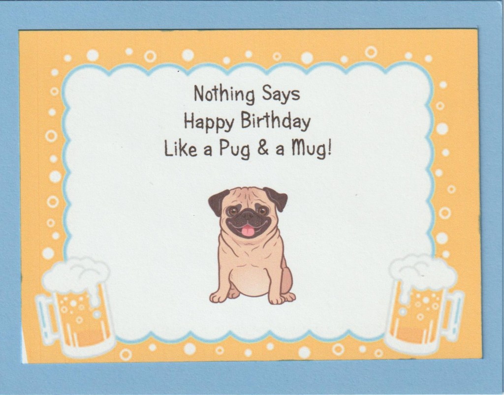 Today’s card is for my niece who loves her pug and likes having some beer. During the night this sentiment popped into my head then I knew what kind of card to make. It is all computer generated which makes this a very short post and feels like I cheated. Whatever would I do without Google??