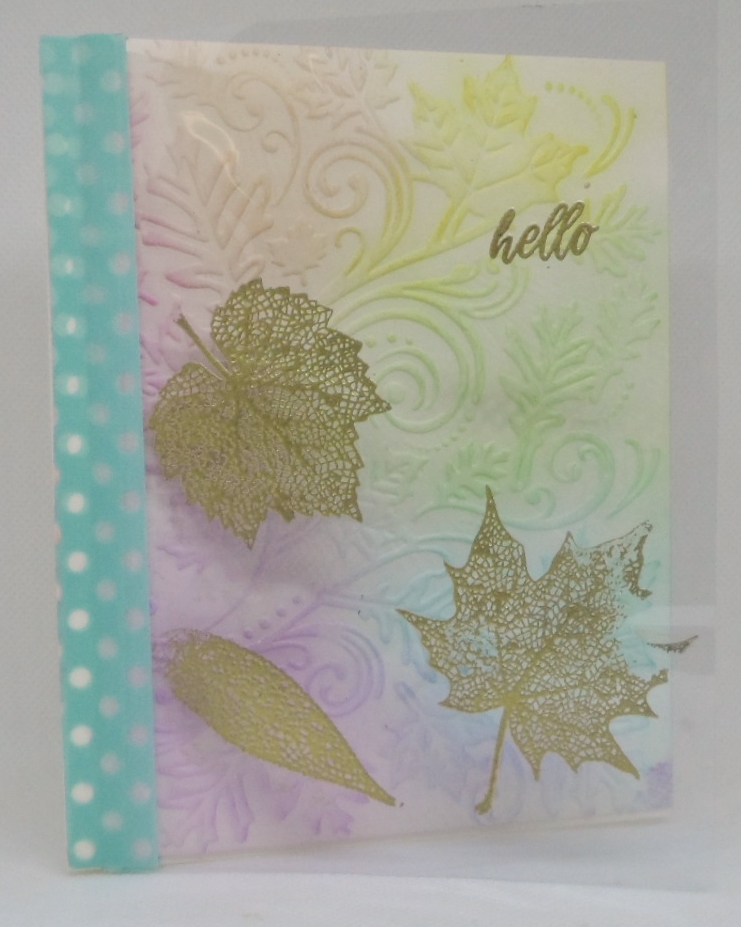 To enter this card into the Can You Handle The Pressure challenge is to use an embossing folder and anything goes with a twist of leaves, I found my lovely Darice embossing folder and embossed ivory cardstock. Using my previously inked blending brushes, I added some soft rainbow colors over my leaves, and attached my panels to a ivory cardbase to complete this card.