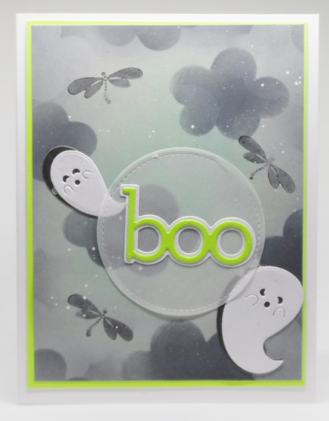 5. I love those soft dragonflies in your lovely background! The bright BOO and those cute ghost are faBOOlous! Thanks for playing with us this month at Paper Dragonfly Creative Challenges! Nan, DT