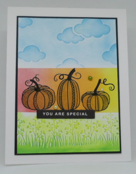 The tractor rides to the pumpkin patch and the corn mazes are beginning to see their last weekend at the local farms in my area but I saved a few pumpkins from the patch for my card today. The challenge with Can You Handle The Pressure challenge blog is Anything Goes Embossing with a Twist of Pumpkins. My embossing folder partial embossed sections were created by using Darice’s clouds embossing folder and Nature 3 pack embossing folder. Both were lightly inked with some Distress Oxide ink. My pumpkin patch was heat embossed over the ink blended middle section of my focal layer. Pumpkins are Gina K Designs Haunts & Harvest stamp set. A little Wink of Stella in gold was added to the pumpkins to help them pop a little. A sentiment from Buddy Bonnie was die cut and layered and a few Taylored Expressions Drip Drops completed my card today.