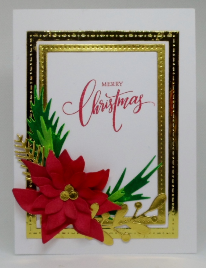 This is an “extra credit” card taught by Dawn Wolesagle to created layered die cuts and add more dimension by adding ink to the die cut pieces. It was a fun card. I had one poinsettia die in my stash however it didn’t include any embossed lines so my poinsettia may be a little on the plain side. The frames were cut using Taylored Expressions Frame in Frame 3 cutting plate, Tim Holtz Festive Trims dies, SimonSaysStamp Christmas Foilage and sentiment from Gina K Designs’s Winter Flower.