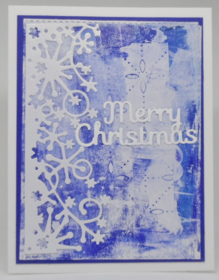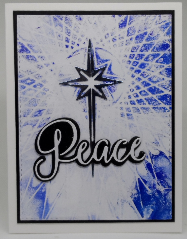 Gel Press Printing — Lydia Fiedler was the instructor in today’s class and it was all about gel press printing. I did create a lot of prints and didn’t throw any of them away so on top of my very inky fingers and messy workspace I did accomplish the task. We were intructed how to use alcohol inks, die cuts and actual metal dies for impressions and to lift an image to add white acrylic paint to achieve a lift. Some attempts were successful and some were not as successful. It was a busy day. For this card I used Birch Press Nativity Star String Art die.