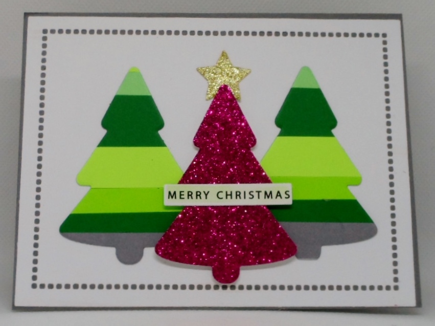 The second instructor, Koren Wiskman, created Striped Christmas Trees using paper strips in various sizes and adhering to a piece of copy paper then die cutting. I added one glittery tree and a star cut from scraps too. I have enough striped paper to die cut at least 2 more trees. Tree die was Her Arts Joann’s Kit.