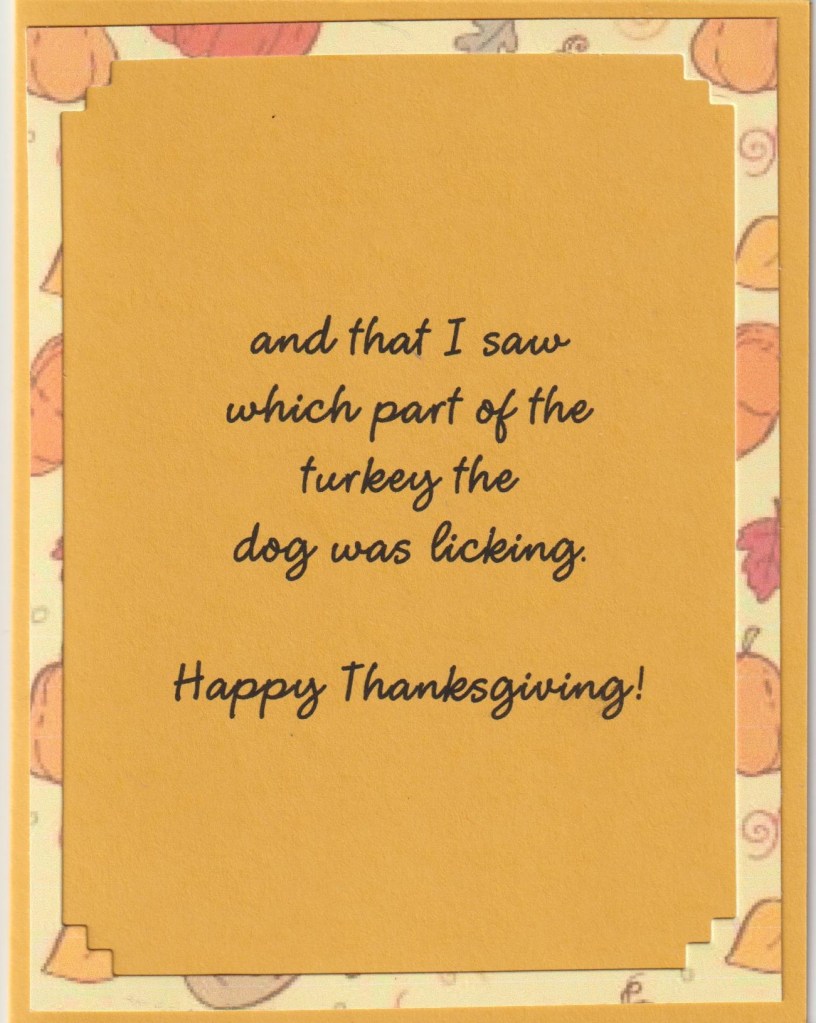 Today’s card is dear-old-sister’s chuckle of the month. Sentiment “I’m thankful for my family, friends, this meal and… that I saw which part of the turkey the dog was licking.” was found somewhere online. Pp was found online, dies used were bought from Amazon. When I die cut the pp I used a 5 /4 x 4″ piece of paper and was able to use the frame for the inside.
