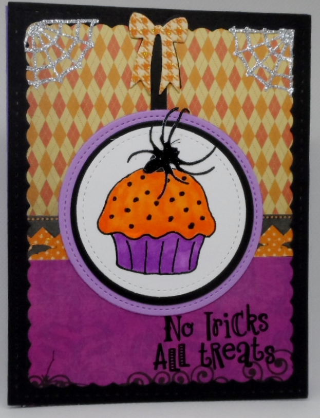 My card uses an older stamp from Inky Antics named Cupcake Birdy. After stamping and coloring in my cupcake I added a delicious spider topping instead of a cherry on top. The sentiment is SimonSaysStamp Happy Haunting, the bow is Taylored Expressions die, the patterened paper and the sparkly web stickers were from my stash and frame was found on my desk.