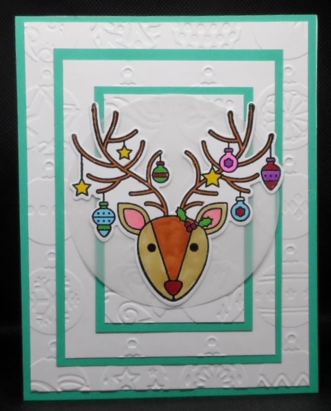 The challenge for the the Can You Handle The Pressure blog is Anything Goes Embossing with a Twist of Christmas. An embossing folder is required for this challenge. My card design was inspired by Stamp Buddy Johanna’s double embossed card for this same challenge. Triple time stamping is one of my favorite techniques so I was curious if it would work using an embossing folder. Using a Cuttlebug rows of ornaments embossing folder I cut the layers for my triple time, positioned them in the embossing folder and ran it through my Big Shot. The focal images matted with colored cardstock and added to my card base. Dasher is a Catherine Pooler stamp set was a freebie from Scrapbook.com. I was glad to find out that the triple time embossing worked but maybe a different folder would show more of the design.