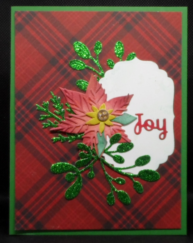 Traditional Christmas colors is the challenge with The Sisterhood of Crafters blog. For my card, I chose some red plaid patterned paper and Tim Holtz Large Funky Festive dies and Spellbinder’s Joy die made my traditional Christmas colors card come together pretty quickly.