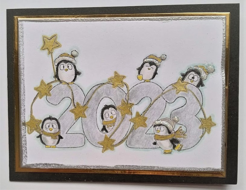 I colored the image with Prismacolor Pencils in Gold and Silver. I did add a bit of orange for the beaks. I came back and used a gold pen quite a bit to make the gold brighter. I used Stickles for the hat and scarfs. I am happy with the card. I think Michelle will like it.