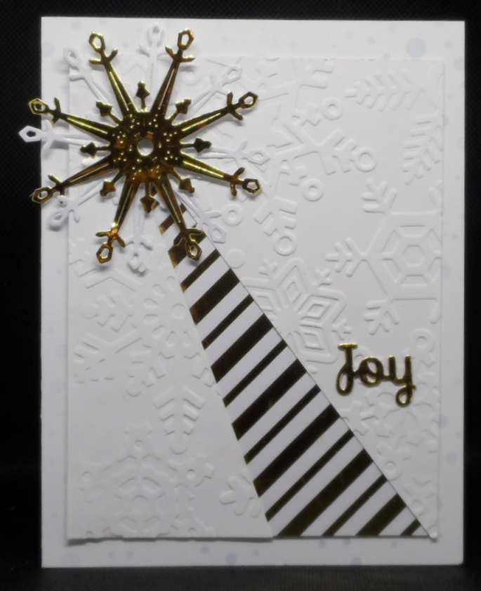 I decided to play along with two challenges today with my gold snowflake card. After cutting down two sections of card stock, I embossed them with my Cuttlebug snowflake embossing folder. I like this type of card design by am challenged to get the dimenstions just right so after many trims of the cardstock it’s better than horrible. The patterned paper is from a Michael’s Recollections gold/black & white pad from my stash. Using Spellbinder’s word die for JOY and I believe Cherry Lynn snowflake die which was cut in gold metallic paper and layered on a white die cut. My card was complete.