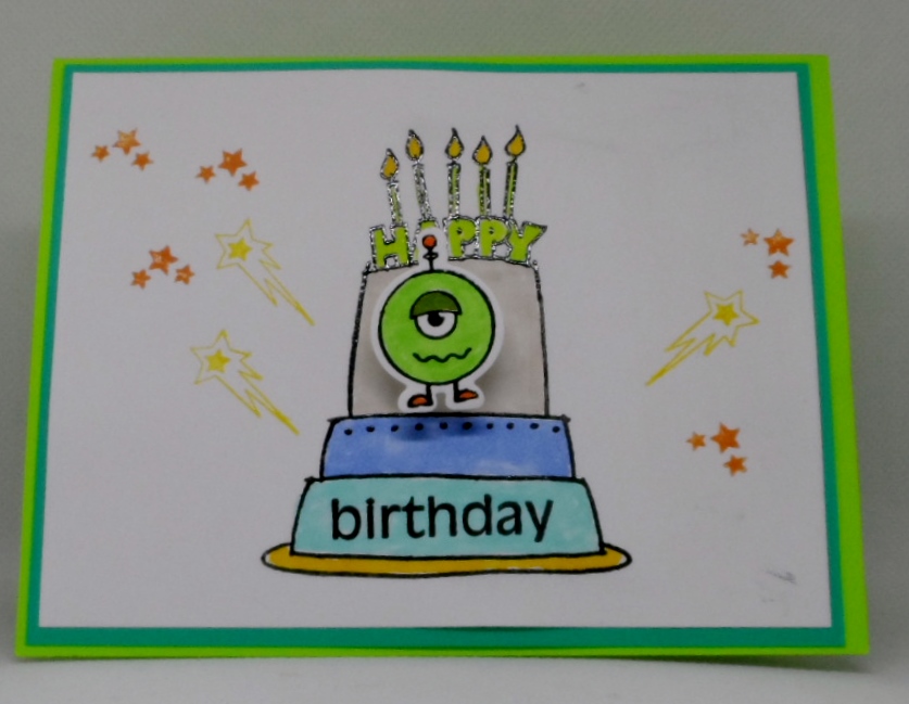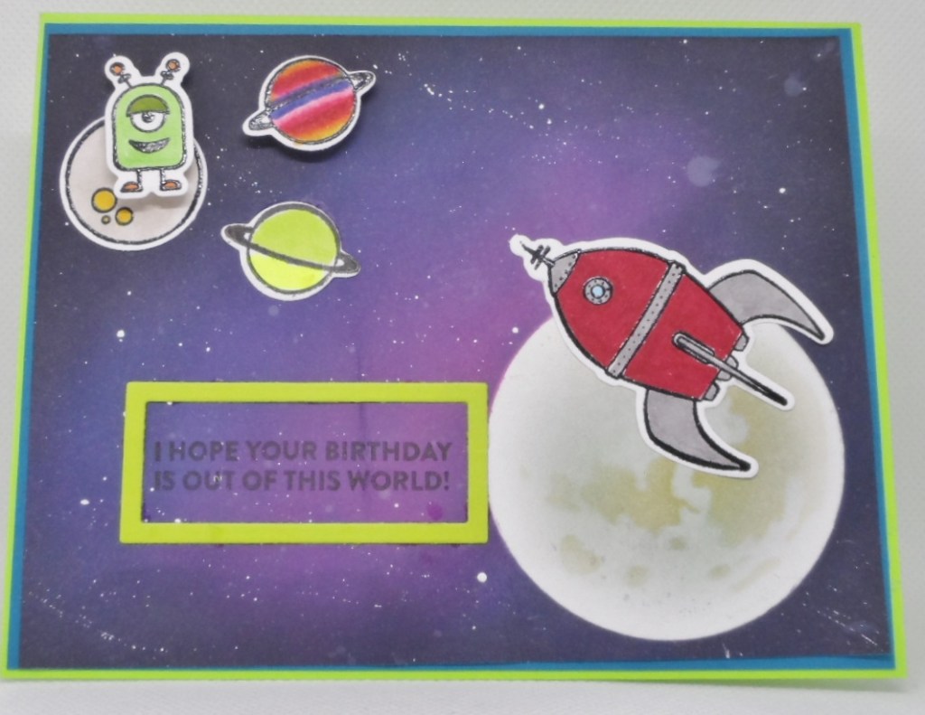This is the inside of the little guy’s card. The birthday cake is from Stampendous named Candles. I lost the 3 so added a little green man to continue with the outer space theme. I should have looked a little longer because that 3 was in my misplaced stamps bin on my desk. 🙂 I think I will put a little note in the card that the rocket ship is “Hemi Powered”. If anyone knows of any good jeep stamps or car stamps, I’d appreciate the share.